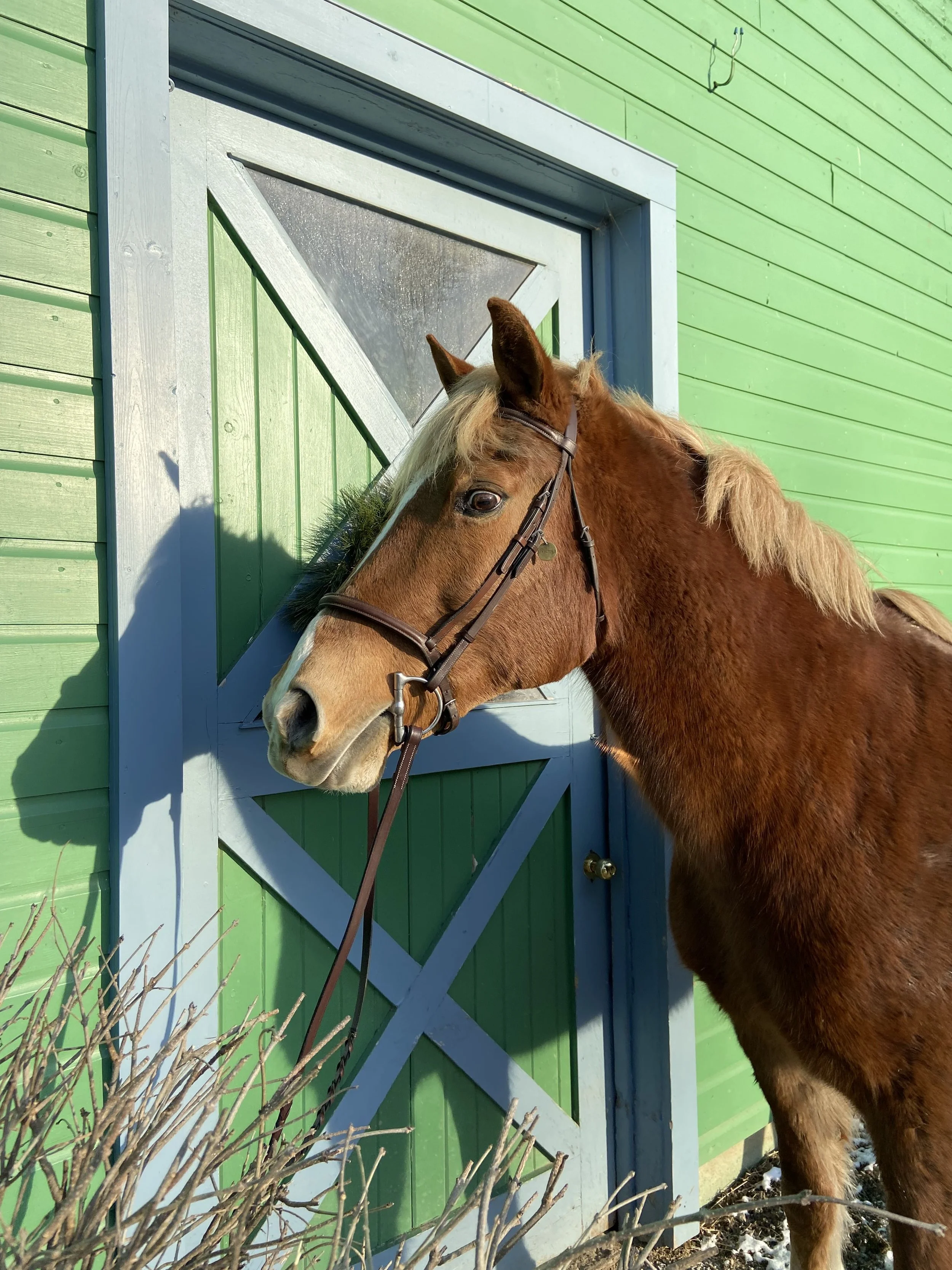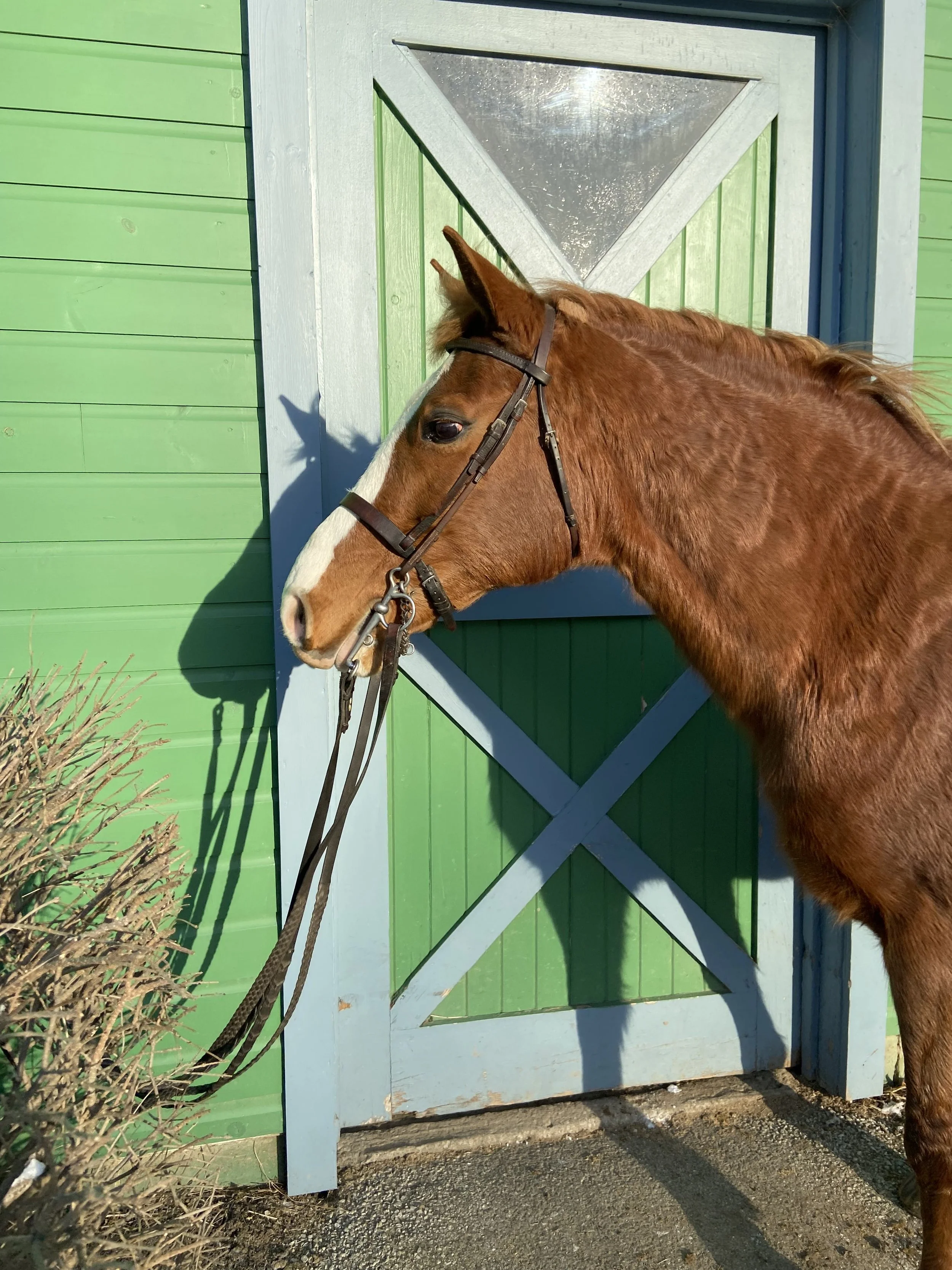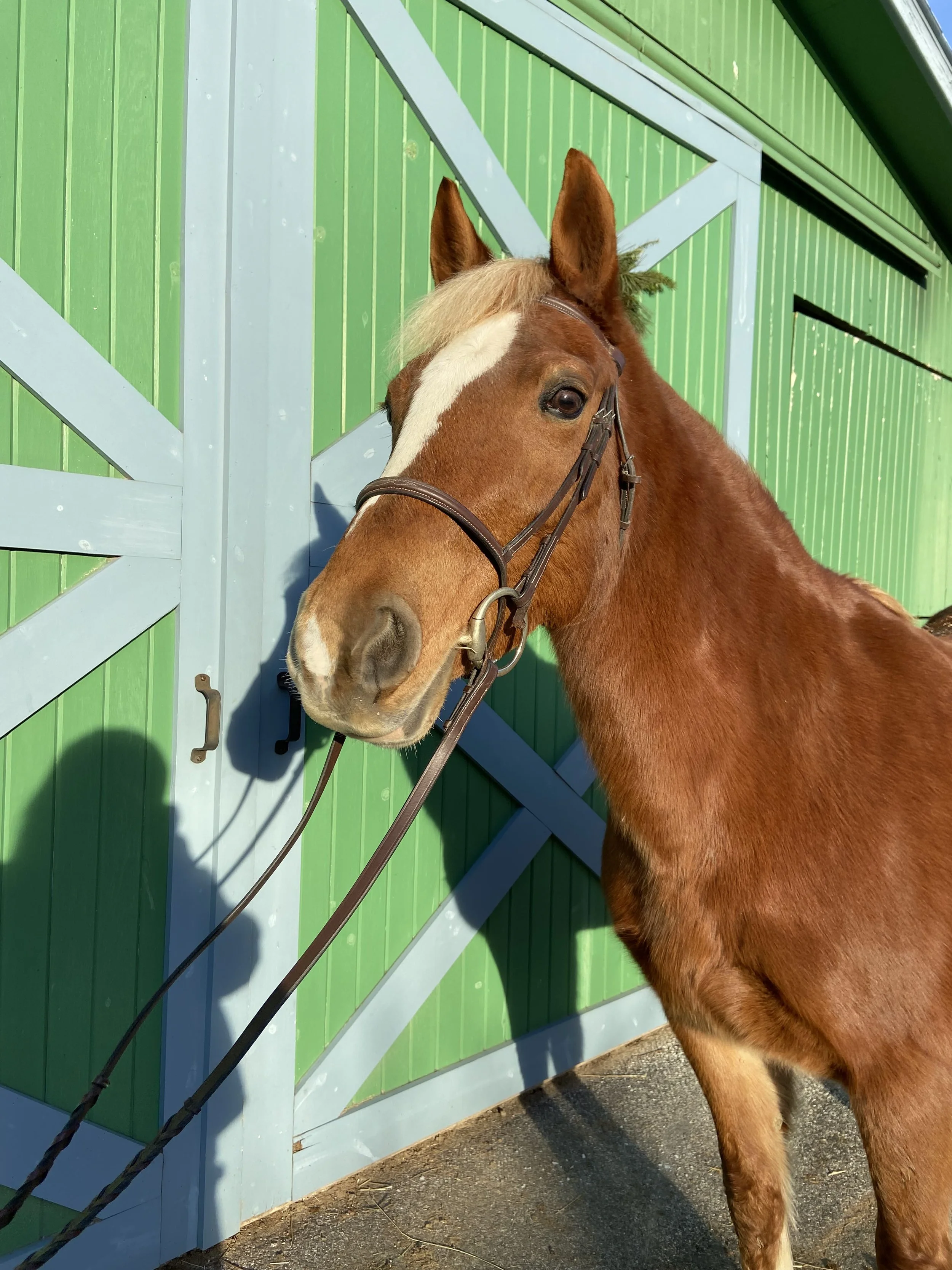 Laid back mare who specializes in teaching jumping, steering, and driving. Loves to grab a bite to eat while out on the trail. Full sibling to Vale and Victor.